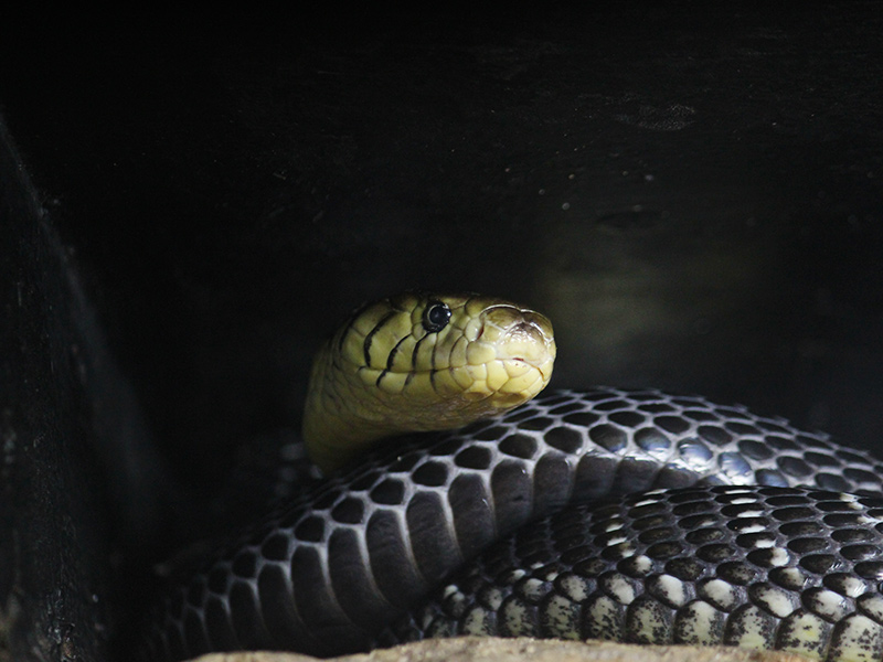 Si te gustan las serpientes no puedes dejar de hacerle una visita a nuestra cobra blanquinegra. Ven al pabellón Veneno de Faunia y aprende más sobre ella.